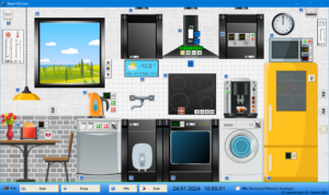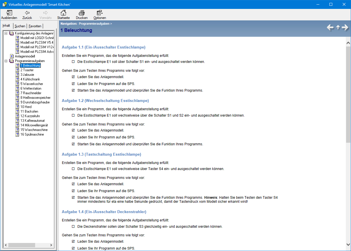Unser virtuelles Anlagenmodell „Smart Kitchen“ umfasst eine Vielzahl typischer Komponenten und Geräte, wie sie in einer modernen Küche zu finden sind. Das Modell mitsamt allen Sensoren und Aktoren läuft dabei auf dem PC und kommuniziert über das Ethernet-Kabel per TCP/IP mit der SPS (z. B. einer Siemens LOGO!) oder auch einem SPS-Simulator wie PLCSIM. Insgesamt etwa 140 Sensoren und Aktoren schaffen dabei eine ausgesprochen realitätsnahe Nachbildung und ermöglichen eine nahezu unerschöpfliche Anzahl von Experimenten, ohne dass irgendwelche zusätzliche Hardware erforderlich wäre. Unser Einführungsvideo demonstriert einige der Möglichkeiten des Anlagenmodells. Zum Lieferumfang des Modells gehört eine Sammlung von über 50 typischen Programmieraufgaben, größtenteils bereits mit entsprechenden Lösungsvorschlägen. Das Anlagenmodell ist zurzeit für die Siemens LOGO! 0BA8 sowie das TIA Portal und WinSPS verfügbar.
