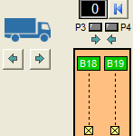 Zur Erfassung der zu- und abfahrenden Fahrzeuge dienen zwei Lichtschranken B18 und B19, die bei Unterbrechung logisches 0-Signal liefern. Über die beiden Taster mit den Pfeil-Symbolen können zu- und abfahrende Fahrzeuge simuliert werden. Die Leuchtanzeigen P3 und P4 signalisieren, ob ein zu- oder abfahrendes Fahrzeug erkannt wurde. Anzeige P6 dient zur Ausgabe von Zahlwerten und kann über den Taster S25 zurückgesetzt werden.