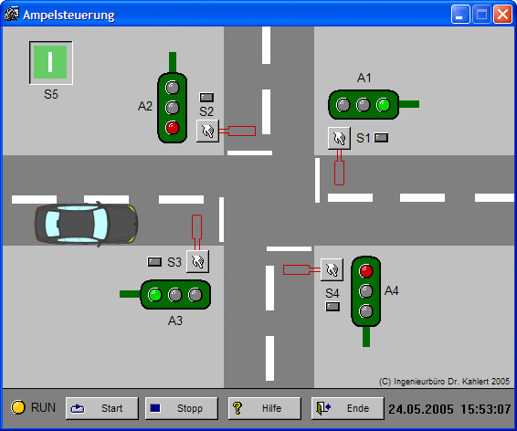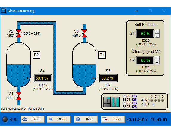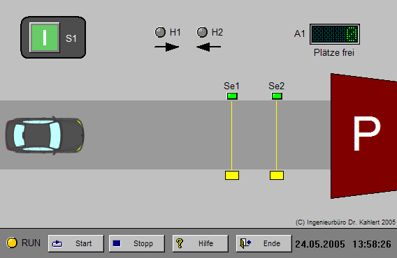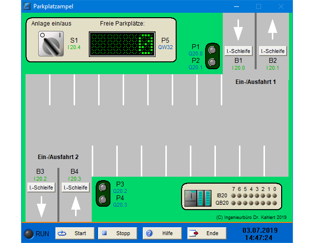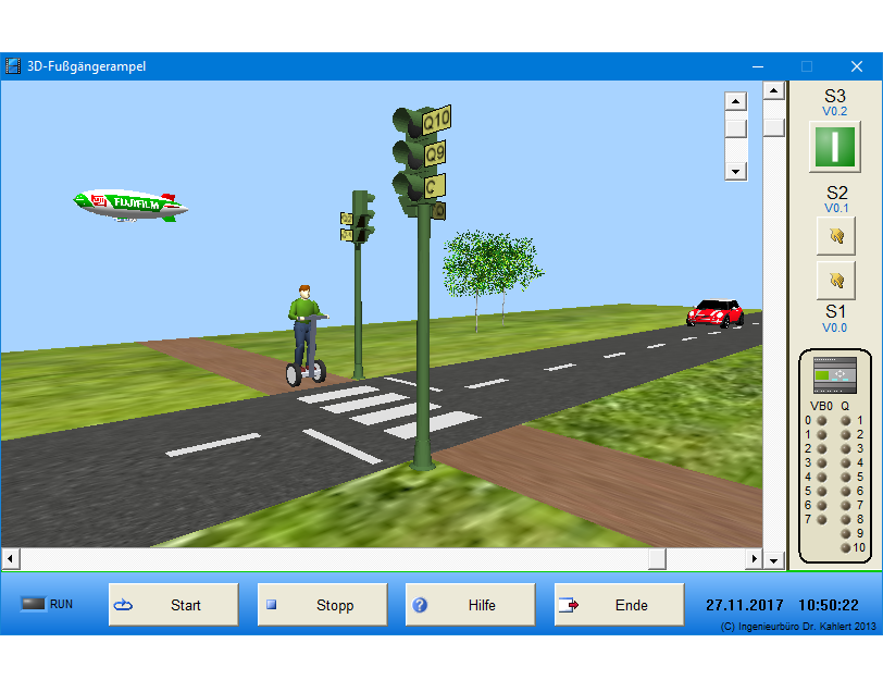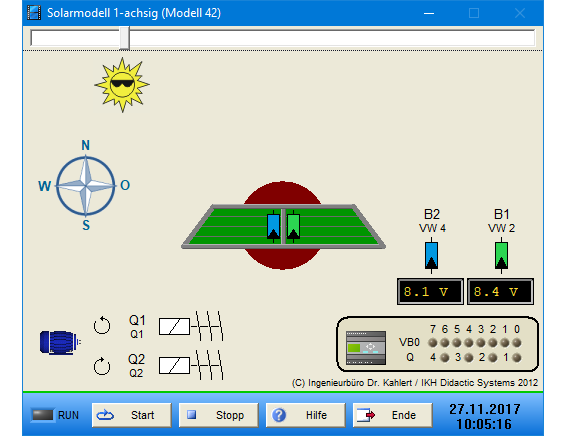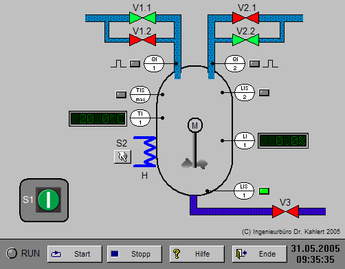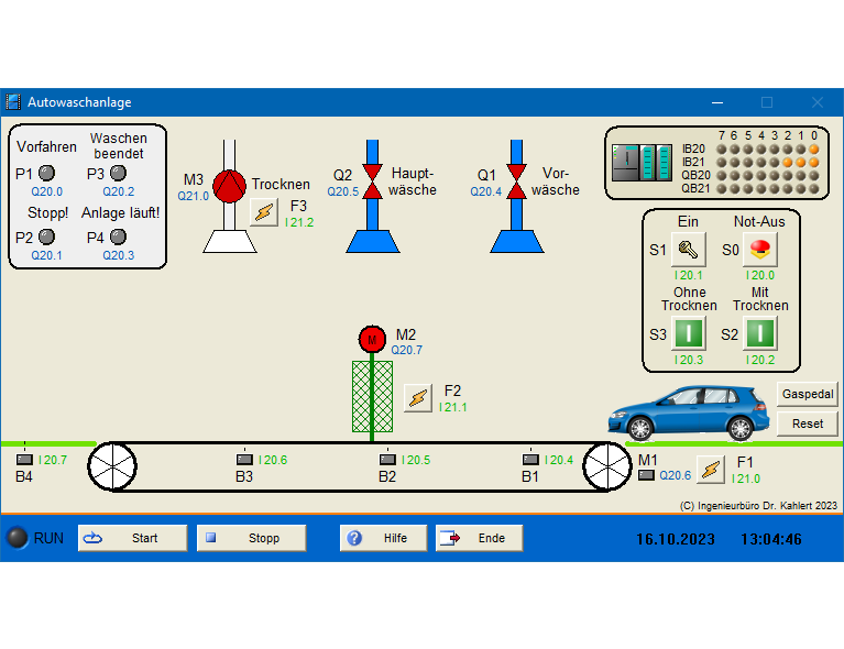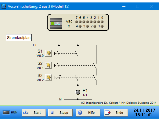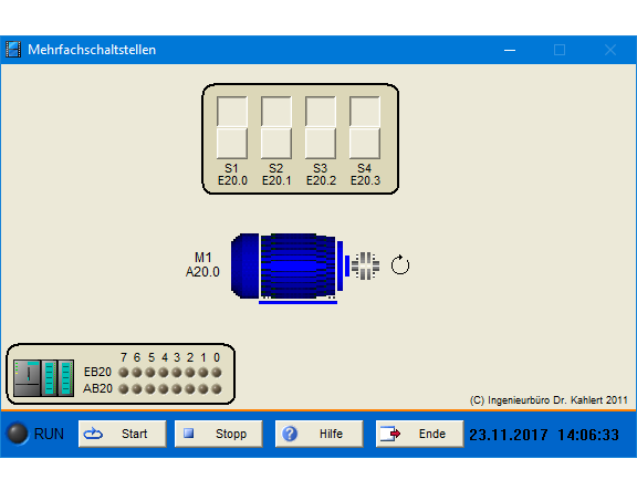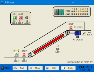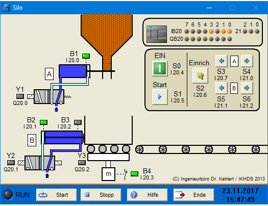 - Über eine Micro-SPS Siemens LOGO! der neuen Baureihen 0BA7/0BA8 mit Ethernet-Anschluss sowie über die Kompakt-SPS Simatic S7-1200/1500. In Zusammenarbeit mit der Firma IKH Didactic Systems wurde ein Satz von zurzeit 37 steuerungstechnischen Simulationsmodellen entwickelt, der optimal auf die Fähigkeiten dieser SPSen abgestimmt ist (IKHDS Edition). Damit eignet er sich perfekt für eine hochwertige und dennoch kostengünstige Ausbildung, da neben der Ethernet-LOGO! bzw. der S7-1200 CPU selbst keine weitere Hardware zur Ansteuerung der Modelle erforderlich ist. Die Modelle weisen unterschiedliche Schwierigkeitsgrade auf, beginnend bei einfachen Verknüpfungssteuerungen über Zeitfunktionen und Zähler bis hin zu Ablaufsteuerungen.
