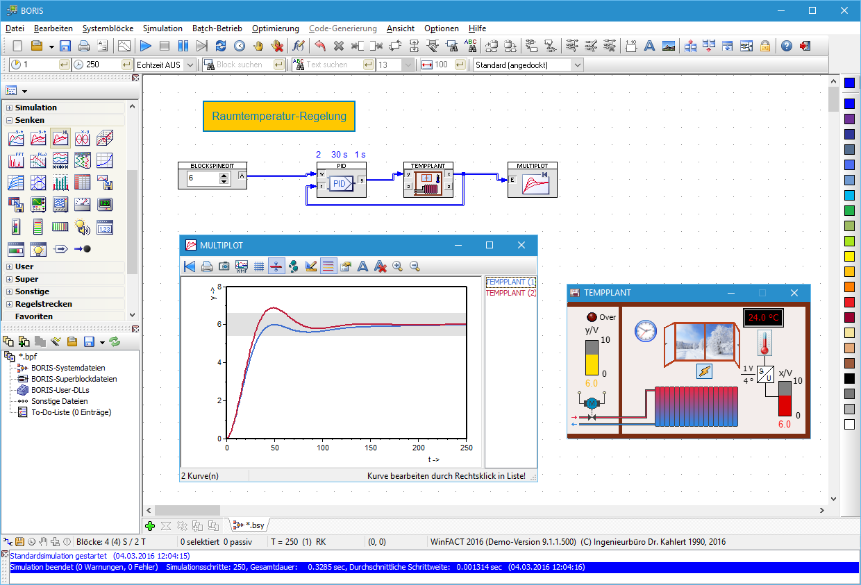 Das WinFACT-Kernmodul, das Blockorientierte Simulationssystem BORIS, ist aufgrund seiner Konzeption neben der prädestinierten Anwendung als Simulationswerkzeug auch in den Bereichen Messdatenerfassung und -verarbeitung, Steuerung und Regelung einsetzbar.