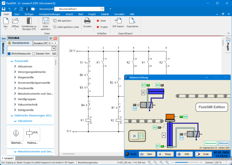 Unsere Virtuellen Anlagenmodelle stehen jetzt auch in einer speziellen Edition für das Simulationssystem FluidSIM zur Verfügung. FluidSIM ermöglich dabei beispielsweise den Entwurf von Relaisschaltungen oder auch Steuerprogrammen in Form von GRAFCETs, die dann interaktiv an unseren Modellen getestet und optimiert werden können. Werfen Sie einen Blick auf unser Einführungsvideo! Die FluidSIM Edition umfasst momentan 12 ausgesuchte Modelle (Preis auf Anfrage).